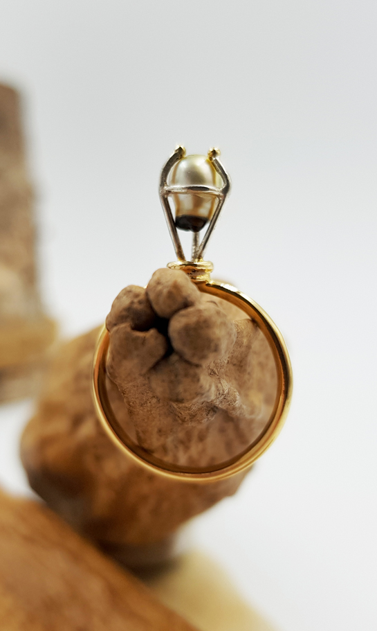 PEARL 8, la dernière de la série PEARL est une bague en or 750/1000 et argent 925/1000 qui sertit une perle Keshi du Japon. Cette perle est une petite merveille toute blanche nacrée avec un petit pied noir. Un ravissement…