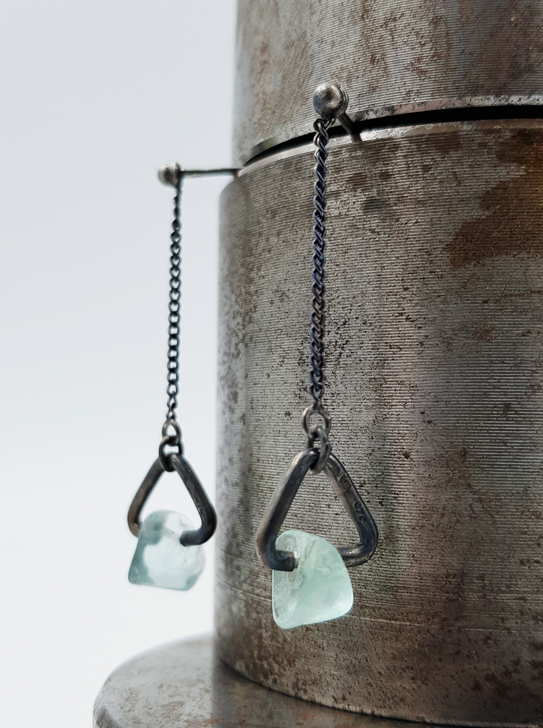 Voici une paire de boucles d’oreilles en argent 925/1000 patiné. La fixation dans le lobe se fait par un picot et la chainette pendante est terminée par une fluorite vert céladon maintenue dans un triangle d’argent