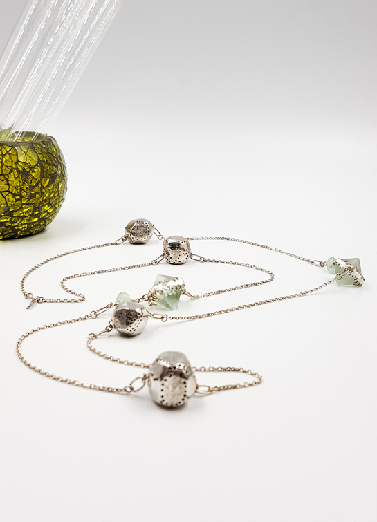 Vous allez succomber à ce sautoir en argent 925/1000, contemporain et féminin. Il est façonné à la main en argent 925/1000 forgé et poli, de 4 cailloux en métal forgé et de 2 magnifique fluorites cubiques brutes refacétées à la main pour cette pièce. Deux petites fluorites semi polies, viennent adoucir les angles des pierres serties.