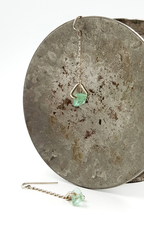 Paire de boucles d’oreilles pendantes en argent 925/1000 poli. L’attache d’oreille est courbe ce qui est original. Elles sont terminées en triangles épais sertissant des fluorites d’un vert céladon, d’une grande modernité