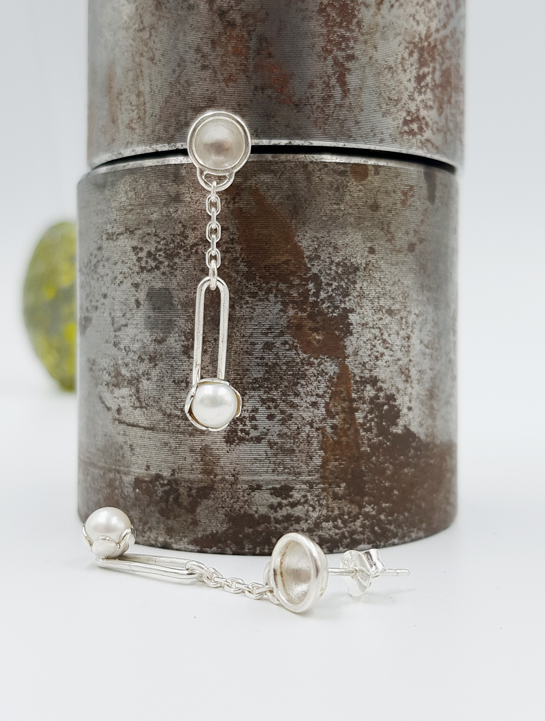 Voici une paire de pendants d’oreilles en argent 925/1000 forgé et poli. Ces bijoux sont sertis de perles blanches d’eau douce.