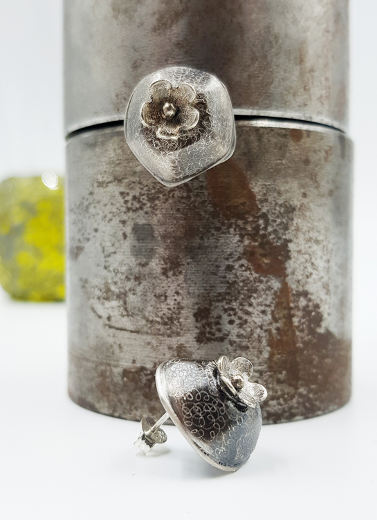 On découvre ici la version boutons d’oreilles avec cette paire d’ornements en argent 925/1000 forgé patiné et guilloché au décor floral pédoncule de datte, signature technique de l’atelier